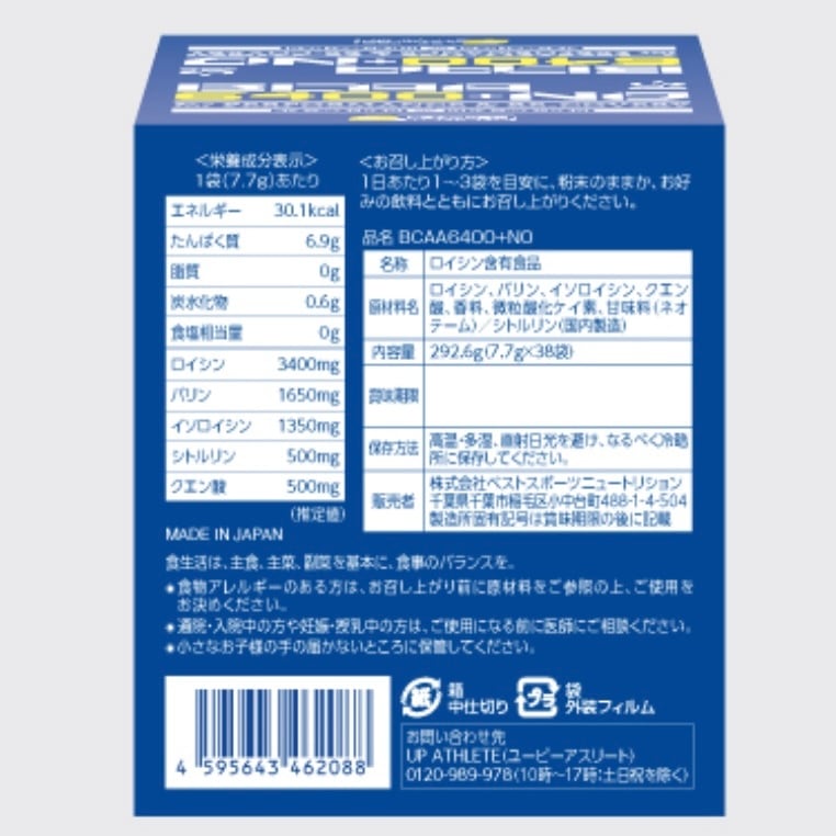 • 1袋にBCAA(ロイシン3300mg/バリン1600mg/イソロイシン1300mg)をしっかり配合